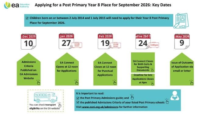 EA Connect will open at 12 noon on Tuesday 27 January and close on Thursday 19 February for Year 8 post-primary applications.